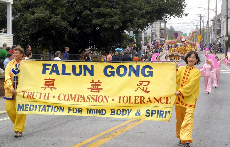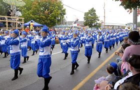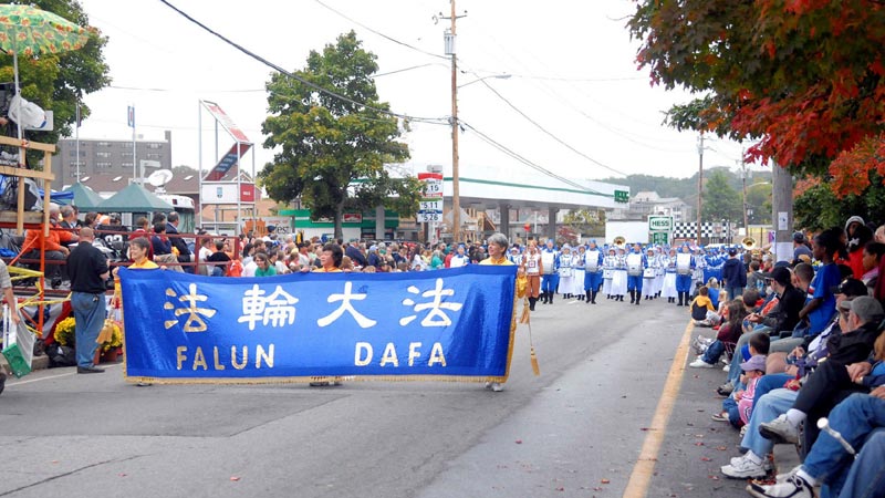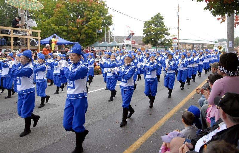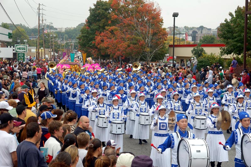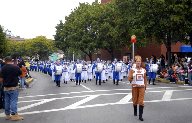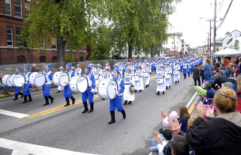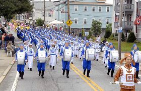【明慧网二零零七年十月九日】二零零七年十月八日,在美国罗德岛州温莎基市(Woonsocket) 举行第二十九届秋季庆祝哥伦布日(Columbus Day)的大游行中,法轮大法的天国乐团、舞龙队和仙女舞蹈队首次被主办单位邀请参加,并作为游行最精彩的方队压阵亮相。其中,天国乐团的百余位成员首次以全新服饰参加游行,其演奏「法轮大法好」、「法鼓法号震十方」、「美丽的美利坚」和「法正乾坤」等乐曲,震撼数万观众的心。