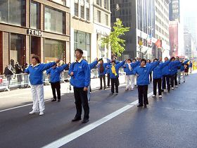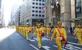法轮大法队伍由炼功和腰鼓队组成,前面的大横幅告诉大家这是“法轮大法”队伍,后面的横幅告诉大家记住“真善忍”准则和“法轮大法好”。路两边的行人聚精会神的看着法轮大法学员的表演,纷纷鼓掌,有个优雅的女士边匆匆走路边大声的鼓掌,表示他们的欢迎、支持和鼓励。很多人拍照,摄影。