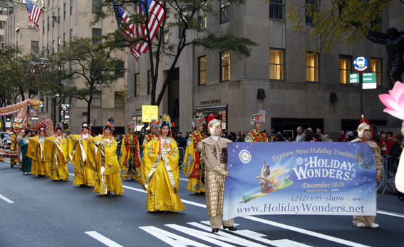 在法轮大法队伍后面的是“新!唐!人:圣诞晚会”的队伍。他们绚丽多彩的服装,美丽多姿的小仙女,还有神气活现的金龙,受到了纽约客的热烈欢迎。人们纷纷举起手机、相机、摄影机,留下这绚烂的一幕。
