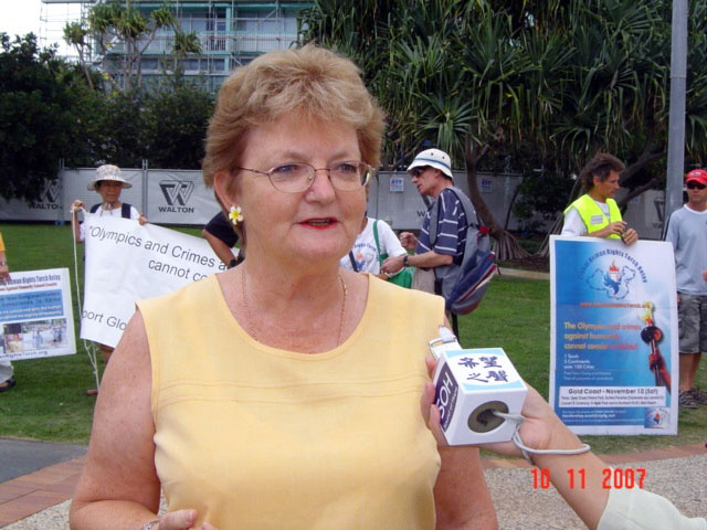 东恩•克瑞奇罗市议员(Dawn Crichlow)表示:奥运是建立在尊重人权的基础上,而中共却无视人权,「我认为中共确实没有遵守《奥林匹克宪章》的第二部份。有一部份人将被禁止参与二零零八年的奥运会,例如法轮功团体,他们被告知不可参加奥运会。这绝不是真正的奥运精神!也因如此,我来支持了这项国际人权圣火传递的活动。」克瑞奇罗也表示,尊重言论和信仰自由的澳洲,是反对中共这种暴行的,「我认为我们必须勇敢的告诉中共,我们绝不允许这种事情发生。」最后她祝愿这支象征希望的人权圣火能在传遍世界各地后,顺利的传入中国。