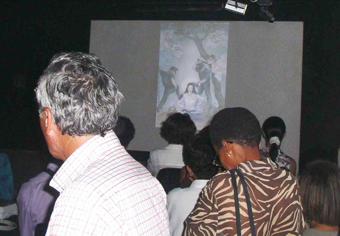 因为距离太远,法轮功学员们没能把作品带到岛上来,然而,他们以投影的方式令四十一幅画作在展厅中展出。这些画是由修炼法轮功的艺术家创作的,画家们用艺术作品向人们展示修炼法轮大法的美好感受及法轮功学员在中国所遭受的残酷迫害。画作和其背后的真实故事使参观者很受感动。