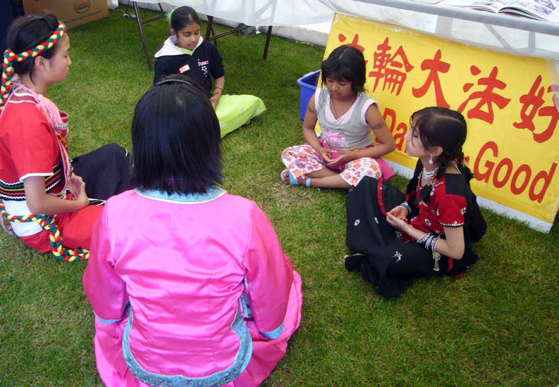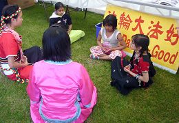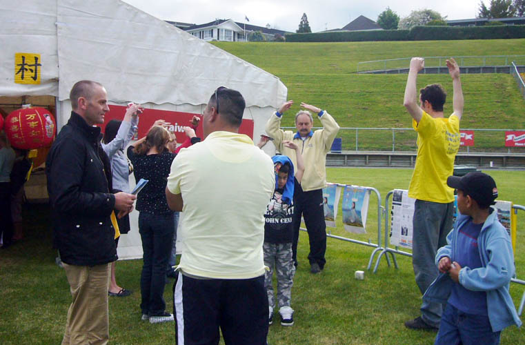 【明慧网二零零七年十一月二日】十月二十七日,新西兰法轮功学员参加了在罗托如阿(Rotorua)体育场举办的二零零七年全球村庆典活动,以功法演示、“真善忍画展”、折纸莲花等方式,向人们介绍以“真善忍”为原则的法轮功,并揭露中共对法轮功修炼者的残酷