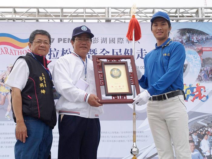 早上八点整,来自各地的长跑爱好者都已摆好架式,期盼能勇夺各组竞赛项目冠军,近七千人的健走组则紧随在前导队伍「天国乐团」之后出发。天国乐团整齐划一的步伐、震撼有力的走过马公市区健走路线,乐团悠扬的乐音更是吸引住大人、小孩驻足观看。