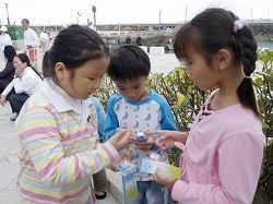 ![]() 沿着游行队伍上,发放由法轮功学员制作的莲花洪法书签,路上小朋友们手拿书签细心研究 |