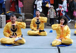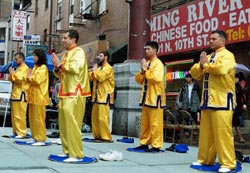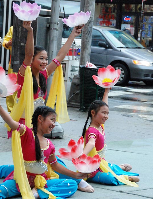 今年夏天才成立的德拉华明慧学校的孩子们,为寒风细雨中的观众表演了歌颂天国世界的舞蹈“莲花颂”。随着音乐声起,孩子们身着飘逸的仙女服,手持荷花翩翩起舞,震撼了整个中国城。华裔音乐爱好者李先生不禁赞叹道:很精彩!想不出刚刚成立的舞蹈队就能表演的这么好。随后孩子们又表演了“只要大家心存善念,世界就充满了希望”的彩绸舞“希望之歌”和“歌颂法轮大法洪传全球八十多个国家”的舞蹈“插莲花”。