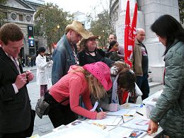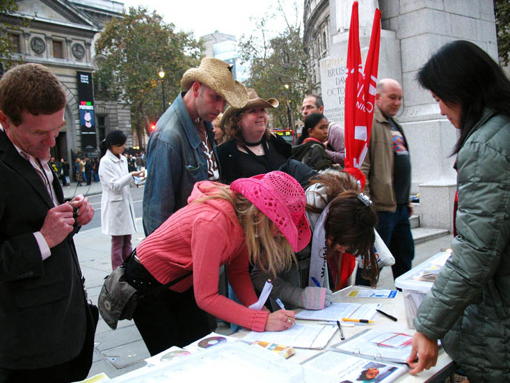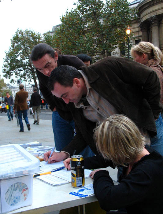 一位英国女士直接走过来在征签表上签字,告诉站在桌旁的学员她是练瑜伽的,她听说过法轮功,知道法轮功好,也知道在中国法轮功受到迫害。她正在鸽子广场参加一个大型集会,她的很多朋友、同事也在那里。她要告诉她的朋友们都来签名支持法轮功。随后,她真的带她的朋友们来签名了,先后两次一共来了二十多人。