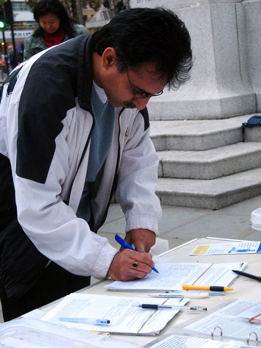 有个先生直接走到摆放征签表的桌子前签字,站在桌前的学员问他知道法轮功吗?他回答说他来自美国,在纽约听过大法弟子讲真相,没想到在伦敦又碰到了法轮功遭受迫害的真相,他对这样非人性的迫害能够发生感到悲哀,他希望迫害立刻停止。