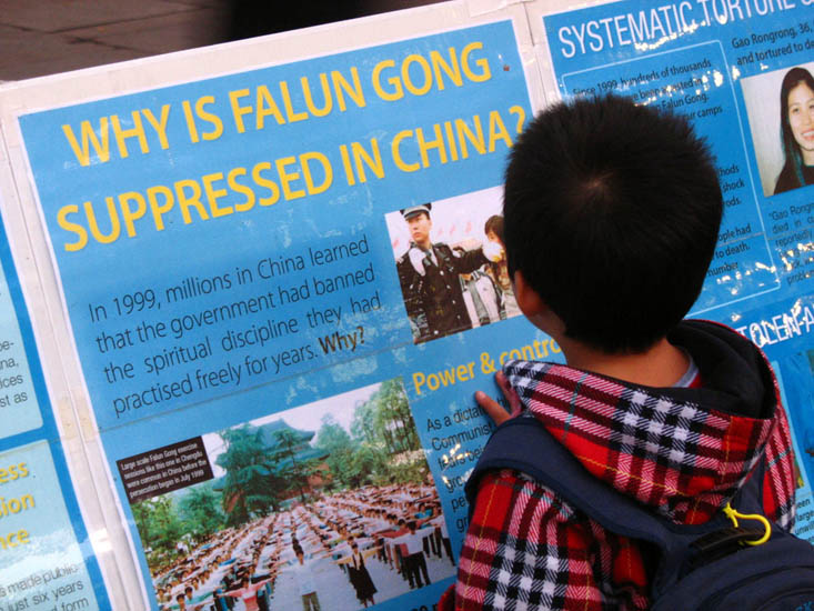一个英国男士和一个华人女士在真相展板前站了很长时间,其中那位男士一直在向女士解释着什么。一位学员走上前去询问,那位男士告诉学员说:他刚从香港回来,他非常清楚法轮功在中国大陆被迫害的事实真相,他相信在这里展示的大量法轮功学员被残酷迫害致死的真实信息会被中国政府封锁而进不了中国大陆,允许进入的信息最多不到百分之十,就象中国老百姓无法看到被隐瞒的“六四”真相一样。这时旁边的女士说:你说的对,在中国我真没看到过这些资料,该女士一边这样说着,一边从学员手中接过了真相传单。