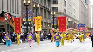 法轮功队伍自二零零三年首次参加芝加哥感恩节游行以来,年年都获邀加入表演。今年,开路的是由三名身着中国古典服饰的年轻女子捧着“真、善、忍”三个大字,这是法轮大法修炼的原则。随后的“法轮大法”“真善忍”幡旗更是耀眼夺目。