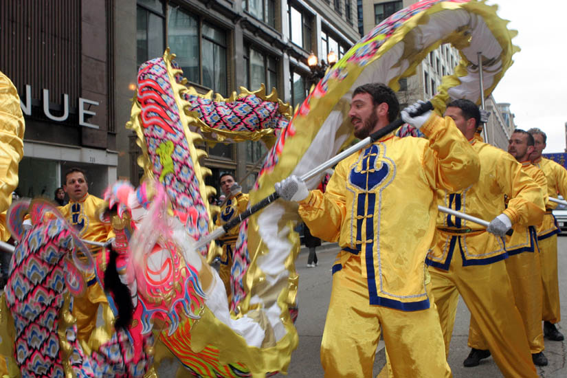今年芝加哥学员还特意从纽约邀请来了“映唐舞龙舞狮队”,给感恩节这个传统的美国节日带来中国节庆的韵味。一条名为“凌云”的龙开道,它长达三十英尺,金黄色的龙体加上粉红色的闪光鳞片,由九名各族裔壮小伙子舞动。领舞的弗兰克说,这是他第二次随同“映唐舞龙舞狮队”来到芝加哥。第一次到芝加哥是两年前,“映唐舞龙舞狮队”在艾瑞皇冠剧院为芝加哥首次新!唐!人:新年晚会做开场演出。