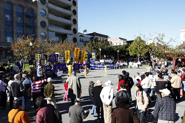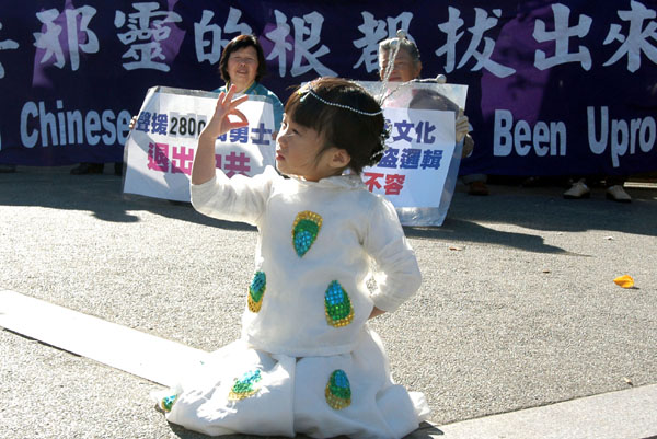 当天中午时分,在旧金山花园角广场上,与会者打着“·九·评*神威”、“天灭中共”、“退!党!自救”等大小横幅标语;明慧学校的学生表演了旗舞、孔雀舞、剑舞等舞蹈,寓意《·九·评*》如剑,勇斩赤龙,挽救中华,迎来中国的新希望。