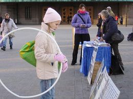 “法轮大法好”的横幅前,两位学员随着优美的炼功音乐演示五套功法;一字排开的迫害真相横幅和展板吸引了匆匆赶路的民众的目光,立即就有人走到征签桌前签名支持法轮功学员反对中共的血腥迫害。还有很多人主动和学员交谈,了解更多真相,或发表看法。