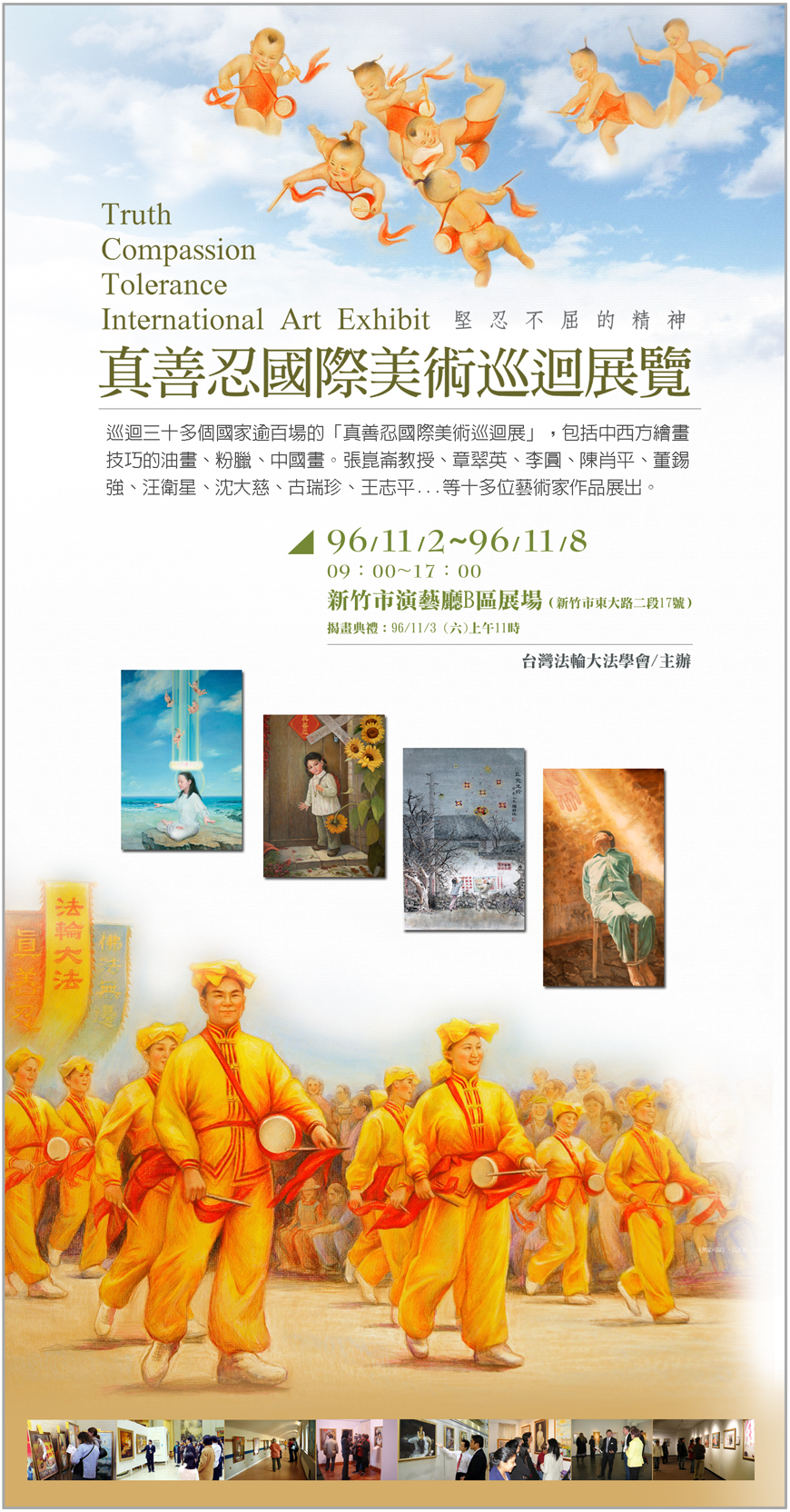 艺术作品的永恒性与普世性,在于它能够激励与提升人们的心灵与精神,真善忍美展画作溶合了东西方传统文化艺术精华,由专业造诣的艺术家所创作的雕塑、油画及国画作品组成。这些作品是描绘对人生真理的追求,对神的赞美,以及对人类内在与外在的善恶之争,也刻画了在当前这场人类的浩劫--江××发起的对法轮功迫害中善与恶的表现。真善忍美展在文化古都新竹演艺厅为人们心灵成长的感动揭开了序幕。
