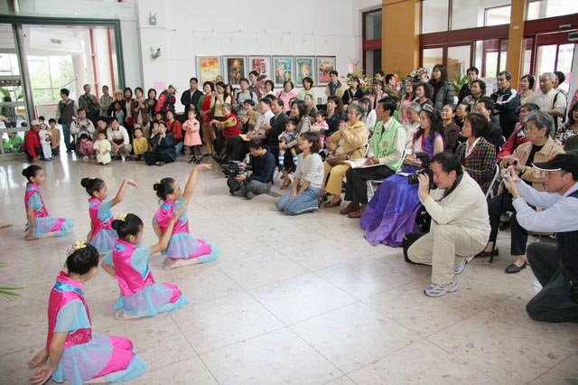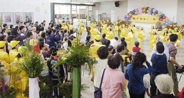 「真善忍国际美展」开幕式的表演中,足迹遍全球的团体「天国乐团」演出获得观众如雷的掌声;身穿金黄服饰的「腰鼓队」精神抖擞、神采奕奕精湛的演出,也博得满堂彩。可爱的「豆豆园」小朋友表演,则让会场气氛达到最高点。