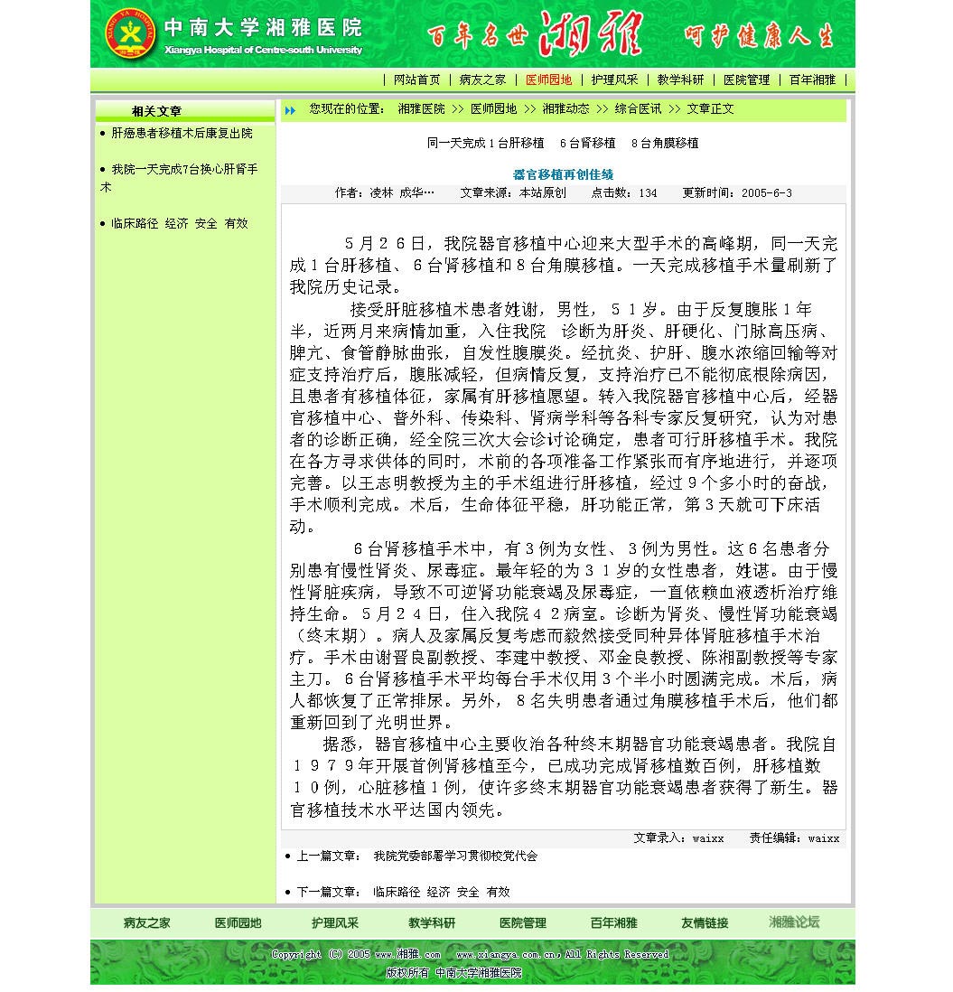 湖南医科大学附一医院创建于1906年11月,当时称“雅礼医院”,1914年更名为湘雅医院。于1992年10月正式恢复“湘雅医院”名称。在本地有湘雅附一、湘雅附二、湘雅附三,而其实“附二”始建于1958年,隶属于国家教育部直管的中南大学;“附三”是由国家卫生部“八五”期间建的,于1992年12月试运行。“附一”才是湘雅医院。湘雅医院的网站就有诸多报道,如2005年9月3日“综合医讯”栏目就《大型器官移植渐成家常便饭》和“同一天完成1台肝移植 6台肾移植 8台角膜移植”的报道(https://www.xiangya.com.cn/medpro/xyyx/zhyx/2005-06-03/medpro_20050603230411.html)。