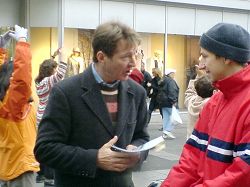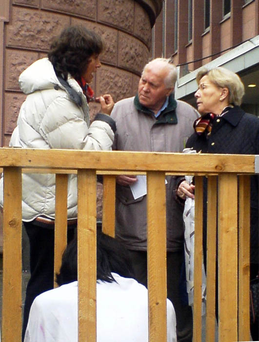 ![]() 心与心的对话。一位德国法轮功女学员探过身去,希望能尽全力的帮助两位朴实的老人了解真相。 |