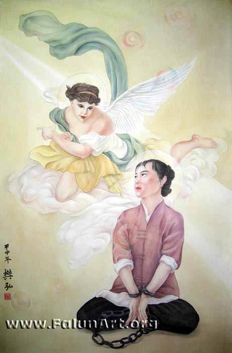 “蒙难在中原”的画作中,年轻的女子坐在床边,双手交叉,紧紧地抓绞着自己臂膀上的衣服。泪珠在微光下闪烁。男子横躺着,头倒坠;一手捂着身体,血从指缝中流出;另一臂直直的垂着,松开的手指中有一张被撕的“洗脑书”。他戴着脚镣,死在囚禁他的地方。画家以蒙住眼睛的红布条代表红色恐怖,暗示中共长期以来对中国人民的精神控制奴役与折磨;同时展现了法轮功修炼者不放弃信仰,为争取人的最基本的权利而献身的无私与无畏。