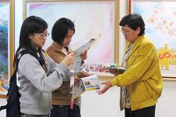 有一位穿梭在校内的职工,前一天已经看过画展了,第二天又来到展场,请求取阅《转法轮》一书。导览人员当即同意,但是对方手上拿着工具箱,自觉不太妥当,他说等工作告一段落,他再来请书,准备回家好好阅读这本改变了世界人心的书。