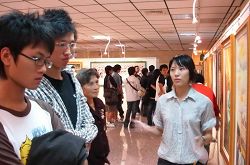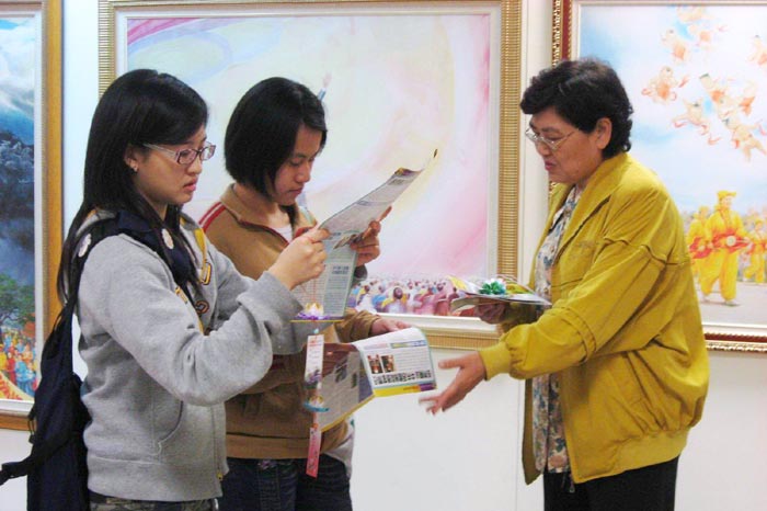 邻近的另一所高雄应用科技大学学生,在得知美展讯息后,利用两天上完学校最后一节课后的傍晚时分,顾不得吃晚餐,四五十名学生,骑着机车,联袂而来,使整个展场气氛顿时热络起来。他们慢慢浏览,细听导览者透过美好的艺术创作细说其中曲折,有关法轮功是什么,为什么在中国大陆遭到残酷打压,却能洪传全世界八十个国家等等。由于每一幅画的背后都有一段动人的故事,导览者引导学生拓展思维空间,关注眼前正在发生的悲壮历史,同时明辨人间是非善恶,惕厉自己坚守正义,长保善念,当下唤起这批大学生的共鸣。他们由原来对法轮功的懵懂印象、漠不关心,到离开展场时有了相当的了解,也明白为什么有越来越多来自国际的声援力量,一名学生忍不住说出心里的想法,觉的自己生活的太安逸、视野太狭窄了,以后他会多去关心世上受苦难的人群,他们说这是课堂内学不到的宝贵一课。