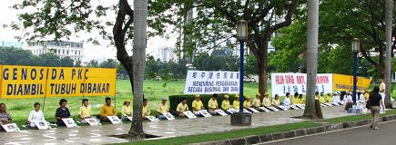 上午十点,法轮功学员首先来到雅加达中使馆前拉开横幅,静坐炼功,“呼吁制止中共迫害法轮功”、要求“停止活摘法轮功学员器官”。