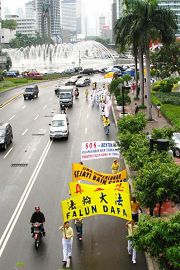 两点,法轮功学员的游行队伍和人权日游行队伍一起,从喷水池向总统府行进。只见身穿黄色上衣、白裤的学员们高举着“法轮大法”、“真善忍”横幅在游行队伍的最前面。一身白色素衣,手拿着被迫害致死大陆同修相片的学员静静的走在游行队伍中,他们中很多是小学员,那一个个凝重的神情,寄托着对被迫害致死的大法弟子的哀思。队伍中最让人触目惊心的是一个“中国警察”正用警棍“击打”两位已经是“遍体鳞伤”的法轮功学员,这是揭露中共暴行的模拟演示。沿途学员向路人分发真相资料。整个游行过程都有警察疏通交通,保证了游行的顺利进行。