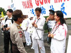 ![]() 总统府前的警官在向演示酷刑迫害的法轮功学员了解真相 |