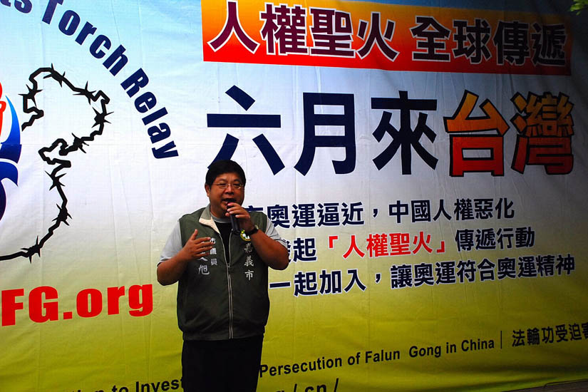 本身也是CIPFG成员的嘉义市议员蔡文旭,义愤填膺的表示:「在中国受中共身体虐待、失去自由的法轮功学员不只几百个、几千个,是几十万人,我站在维护人权、坚持人身免受恐惧与迫害的立场,我要勇敢站出来向中共说不能迫害人民;作为民意代表,我对于法轮功学员坚持反迫害、维护人权的精神非常感佩。」他并呼吁现场民众明年六月一起来支持人权圣火、一起来路跑。中正大学教授艾昌瑞也表示:正义之士应该一起站出来,制止中共迫害人权。