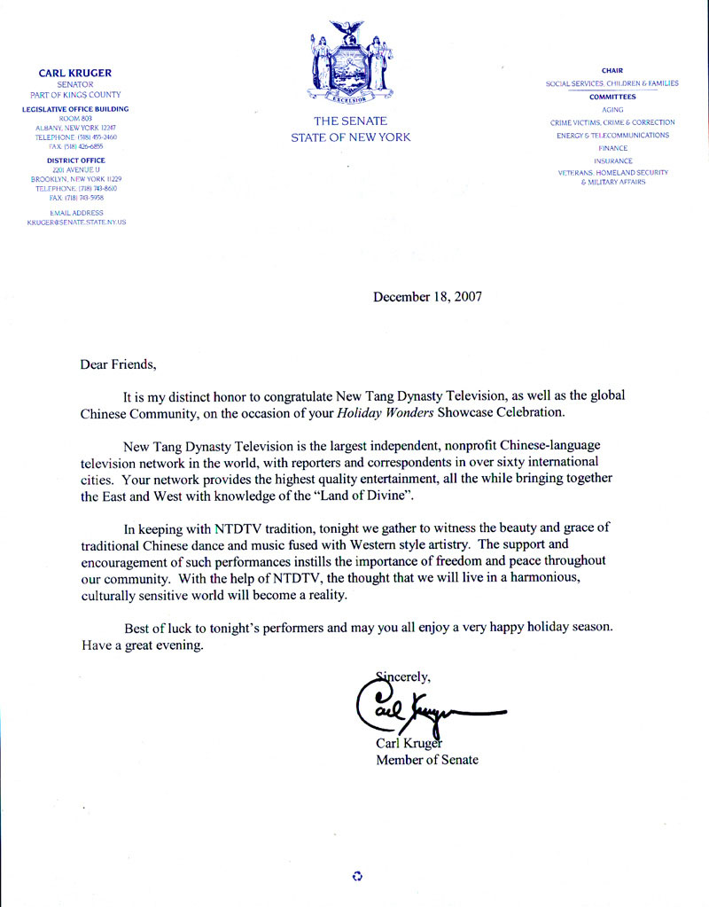 克鲁格参议员表示,新!唐!人:电视台是全世界最大的独立、非营利性中文电视网,在六十多个国际性城市派有记者和通讯员。新!唐!人:电视台提供最高质量的娱乐节目,同时将“神州”的魅力带向东西方。