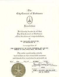 巴尔的摩市议会向华盛顿特区法轮大法学会致以最诚挚的祝贺,以表彰你们邀请神韵艺术团在巴尔的摩丽瑞克歌剧院演出圣诞晚会。