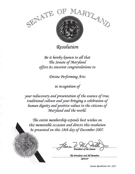 马里兰州参议院向神韵艺术团致以最诚挚的祝贺,以表彰你们再现和展示真正传统文化的精髓,以及为马里兰州和全世界的居民带来人类尊严和积极价值的庆典。
