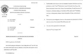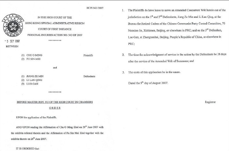 两名原告法轮功学员朱柯明与傅学英,今年六月二十八日向高等法院提告前中共国家主席江泽民、前国务院副总理李岚清和前政法委书记罗干,指控他们触犯酷刑、伤害、非法监禁、滥权等罪,要求民事赔偿。由于这宗诉江案发生在中共政权控制下的香港,故备受各方关注。