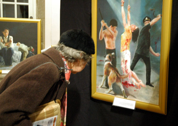 基督教反酷刑组织成员玛丽•法郎丝:「我深深的被这些画表现的内容所触动,仿佛看一幅幅真实的摄影作品,我虽然对一些酷刑有所了解,但没有想象到残忍到这种地步,每幅画都是触目惊心。」