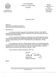 新!唐!人:电视台以这样崇高的使命为己任,因此在新!唐!人:电视台举办二零零八全球华人新年晚会及圣诞奇观之际,理应受到纽约州人民的致敬和赞扬。