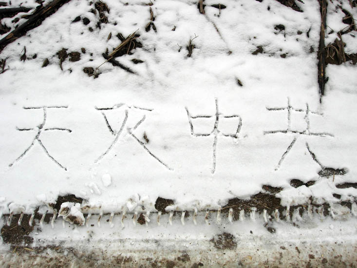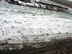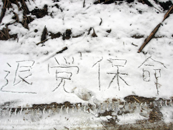 2007年12月初的一场雪过后,河北某地人们走在小路上发现路边写有:“天灭中共”“退!党!保命”“退!党!退*团-退*队-”等标语。以别具一格的形式向世人传递着天意:“天灭中共退!党!保命”!