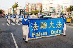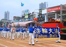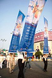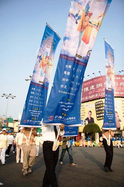 ![]() 屏东市游行中为美国神韵艺术团宣传旗帜 |
