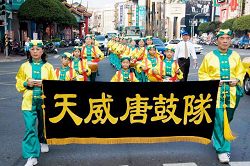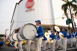 来不及尝一碗潮州有名的冷热冰,整个乐团已带队到万丹参加农业产业文化嘉年华的演出,再转至屏东市区,乐团结合当地法轮功成员及天威唐鼓队,为明年三月将来台演出的美国神韵艺术团作宣传造势游行,为周末热闹的屏东街头增添了不少文艺气息。
