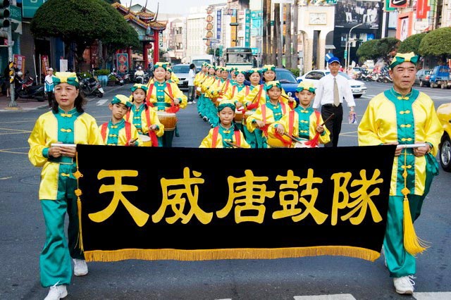 ![]() 屏东市游行队伍中,鲜艳服装的天威唐鼓队 |