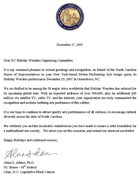 美国北卡罗莱纳州第五十八选区的州议员艾尔玛•亚当斯(Alma S. Adams)博士,代表北卡罗莱纳州议会,向即将在北卡上演的新!唐!人:圣诞晚会发来褒奖,译文如下: