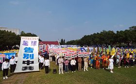 谢小姐带着家人到台中公园游玩,适逢这场盛会,她很早就知道法轮功受迫害的讯息,她表示:「每个人都有宗教信仰的自由,而且宗教都是劝善的,这没什么好禁止的。」
