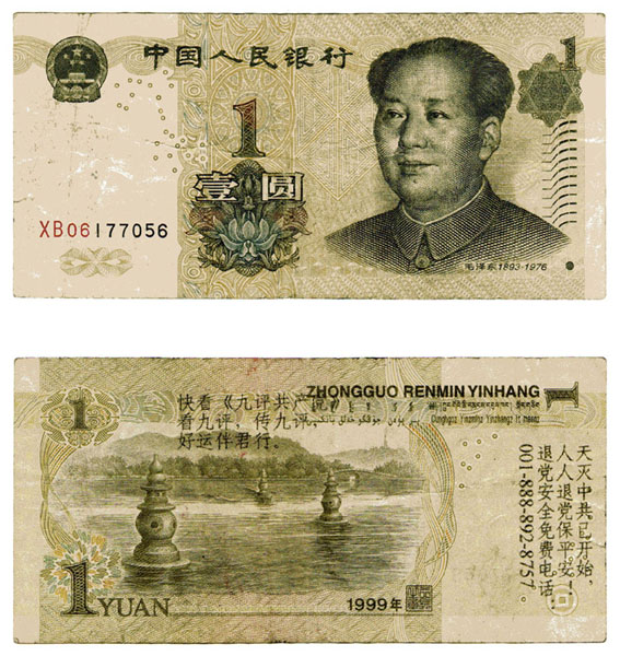 ![]() 自二零零五年十月开始,中国大陆许多地方的人民币上,出现三:退.资讯 |