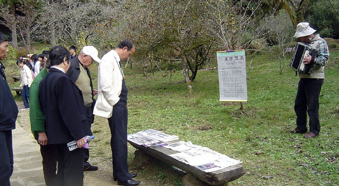 阿里山弥漫着山岚,在木兰园我们的琴声歌声缭绕,仿佛世外桃源。一批又一批的大陆游客路过,有的停下来照相,有的换上山地服装拍照留念。有的和我们唱着“为你而来”,很自然的跟他讲真相并化名三:退.了。有的看椅子上的真相资料,默默的看了许久。学员告诉他:“你今天能来阿里山,也不是偶然的,除了欣赏阿里山的风景,更要明白真相,这是老天爷给你选择未来的机会,快快三:退.吧!”