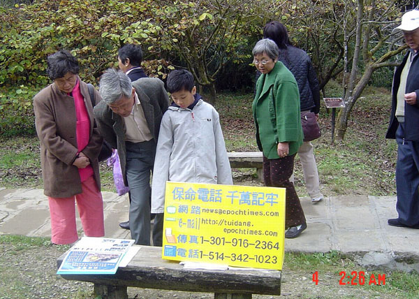 其中有一批大陆客是来自东北吉林的,同修就跟他们说东北有三宝,跟其中一位女大陆客讲真相,也帮她取个化名退!党!。之后又有一批来自华山的大陆游客,刚好有个同修看到就开始跟其中一位伯伯聊天,也跟他讲三:退.,最后帮他取个化名退!党!。