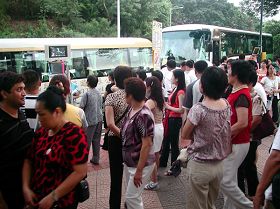 很多旅游车都来光顾这个景点。随着每一拨人群的上下车,法轮功学员都迎上去给他们发·九·评*。经常有中国游客问我·九·评*的内容讲什么,我就抓住机会介绍,还告诉他们这本书被翻译成多种语言,在全世界很多国家都能看到。每天发行的大.纪.元;时报和一些特刊也很抢手。