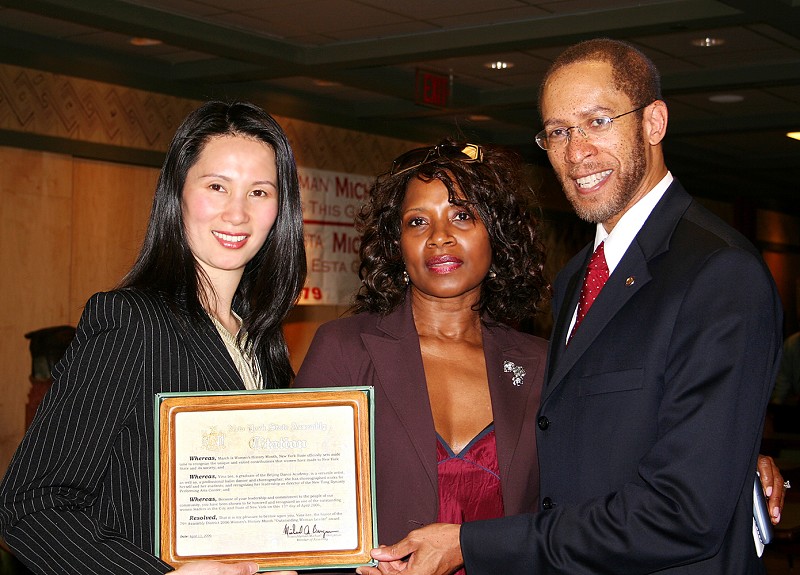 ![]() 二零零六年四月十三日,纽约州议员本杰明主持“纽约州杰出女性表彰会”,新!唐!人:艺术中心主任李维娜女士荣获颁奖。图为本杰明(右)和夫人(中)与李维娜(左)合影。 |