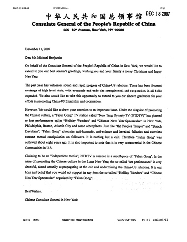 中领馆散发的诬蔑信采用中共恶党一贯使用的手法,诬蔑和攻击法轮功,并且以“中美关系”相威胁,胁迫州议员不要以任何方式“支持”圣诞晚会和新年晚会。本杰明议员表示,公开此信,就是为了让美国人和世界人民都了解中共恶党是最大的邪教。