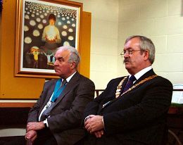 ![]() 剑桥郡东区政府主席弗雷德・布朗、副主席彼得・克瑞斯韦尔专心倾听画展组织者的介绍 |