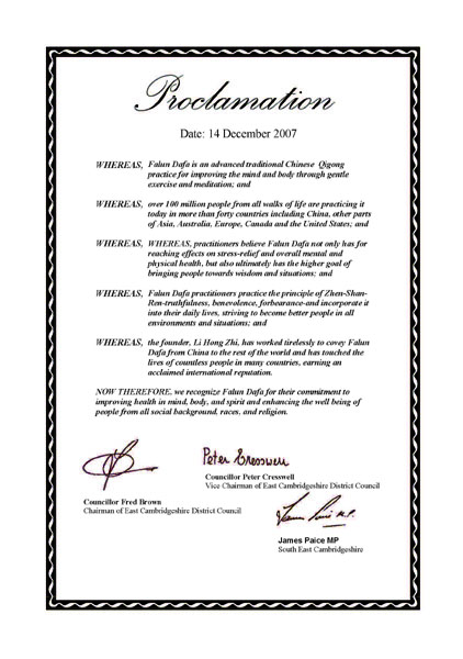 ![]() 剑桥郡东区政府主席弗雷德・布朗、副主席彼得・克瑞斯韦尔以及伊利地区的国会议员詹姆士・佩斯 联名签署了给法轮功的褒奖信,赞扬法轮功给人们带来身心的健康和社会的和平 |