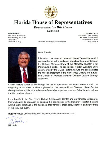 佛罗里达州州议员海勒(Bill Heller)在褒奖信中表示:“通过美不胜收的服装、场景和编舞,圣诞晚会将中国历史复活,并提供正统中国传统文化一瞥。”他说,他肯定观众一定会有一个难忘的经历,充满了美和文化传统的经历。
