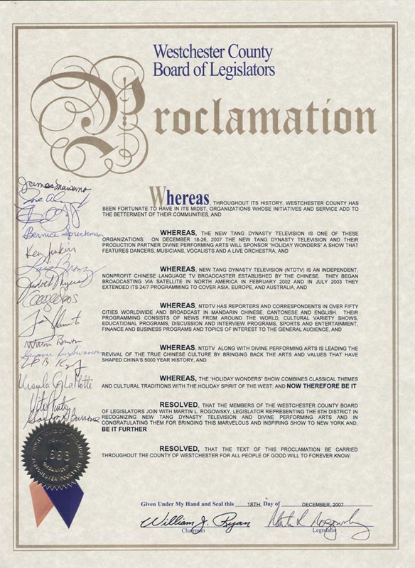 因此,现在决定,西彻斯特(Westchester)县议会,与第六选区议员马丁·洛格斯基(Martin Rogowsky)一起,嘉奖新!唐!人:电视台和神韵艺术团,祝贺他们将如此壮观、感人的晚会带到纽约。
