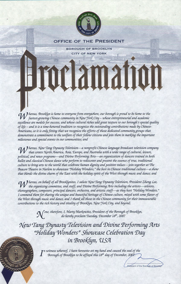 鉴于,我谨代表布鲁克林,向新!唐!人:电视台台长李琮、主办委员会、新!唐!人:全体成员和神韵艺术团的艺术家、歌唱家、编舞、作曲家、舞蹈演员、乐队和艺术制作人员致意。我赞赏他们把这独一无二的、带有西方韵味的精美的中华传统文化呈现给世界,感谢所有在华人社区对具有丰富历史和活力的纽约布鲁克林做出巨大贡献的华人。